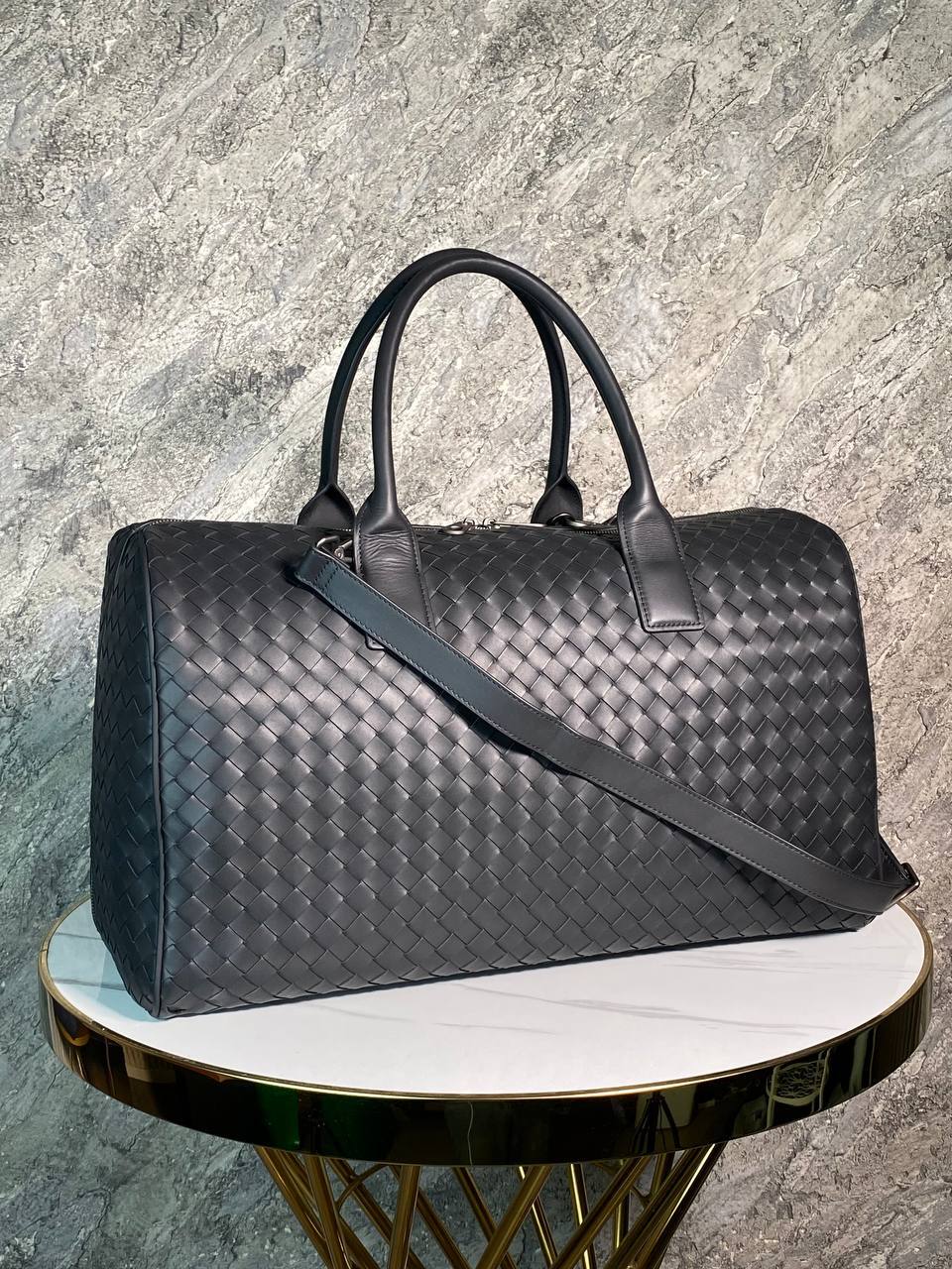 Вместительная дорожная сумка из мягкой плетеной кожи черного цвета - незаменимый аксессуар для путешествий и деловых поездок.