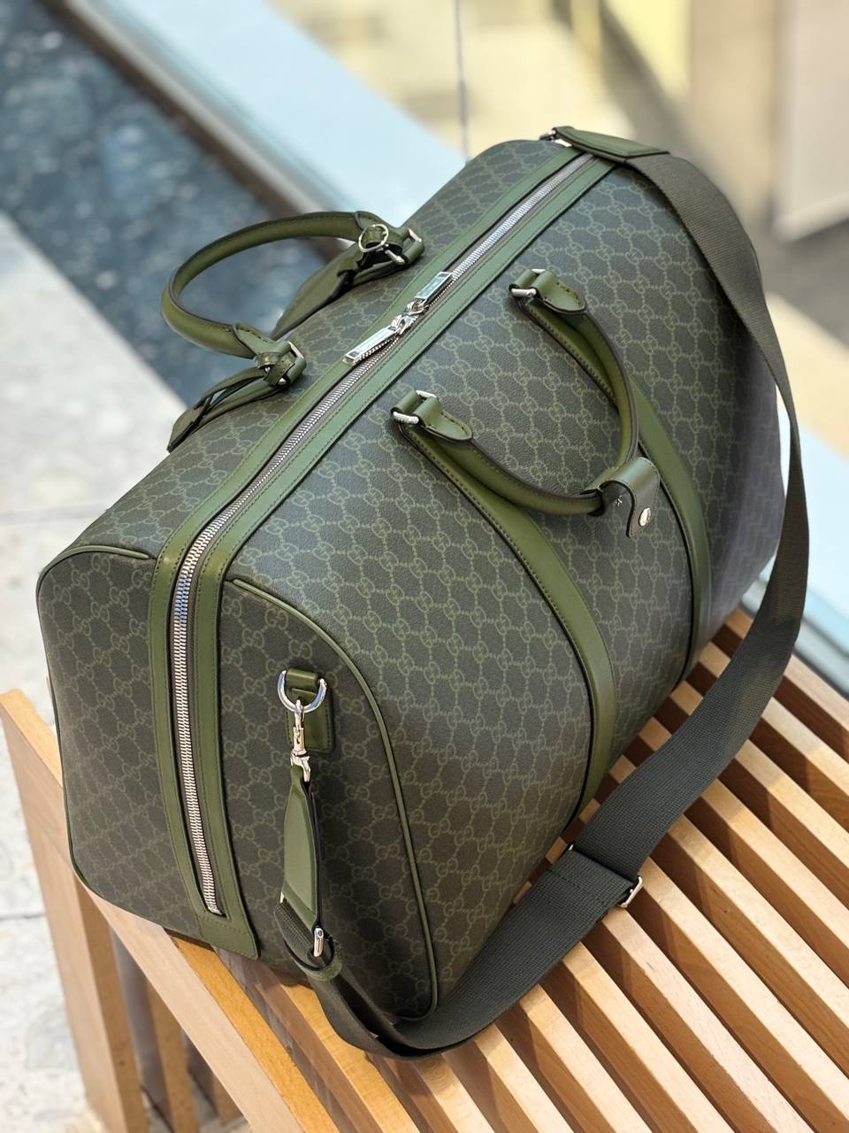 Стильная дорожная сумка из прочной канвы с кожаными укреплениями, монограммный дизайн и полированная фурнитура создают образ безупречного путешественника.