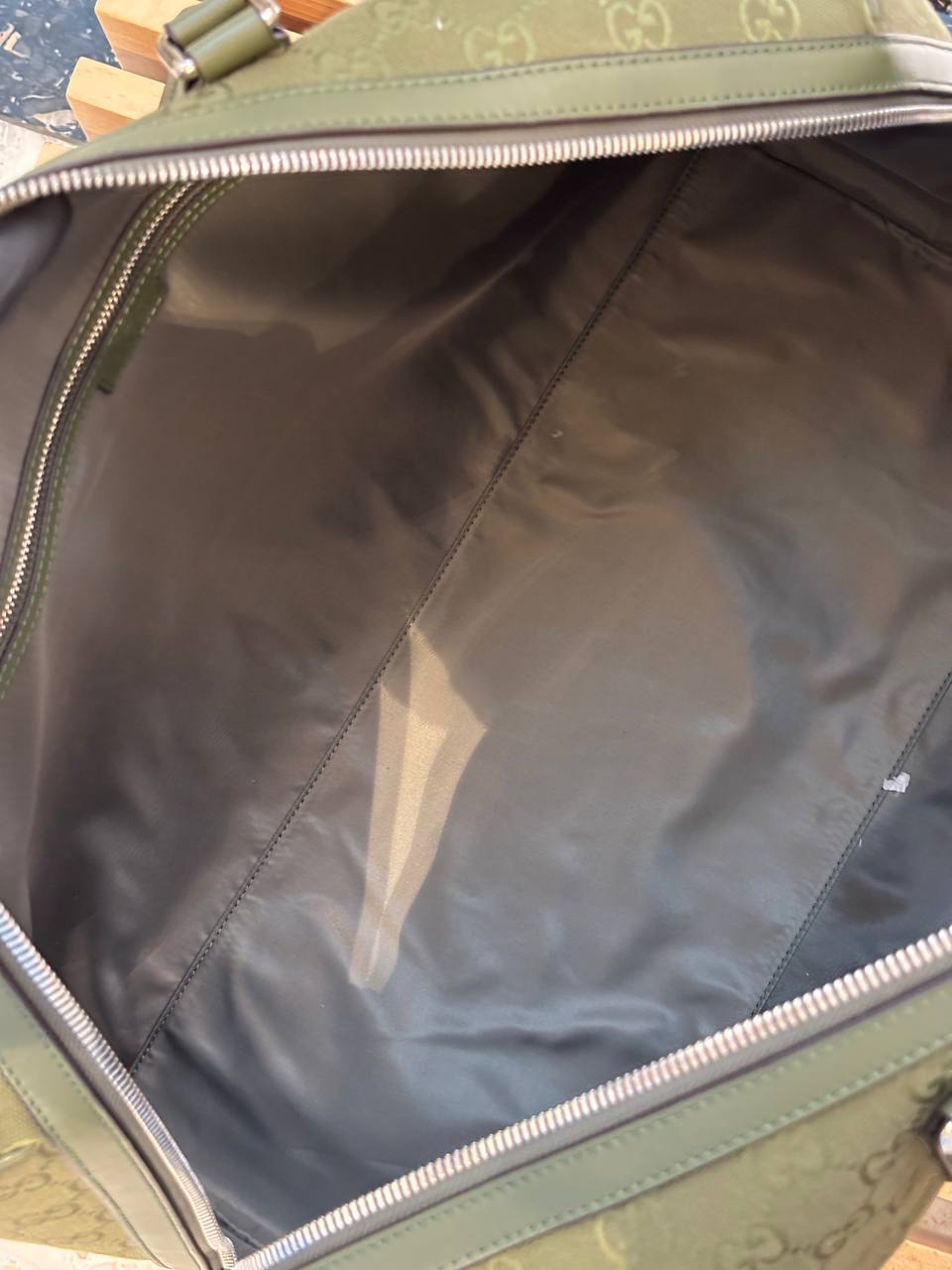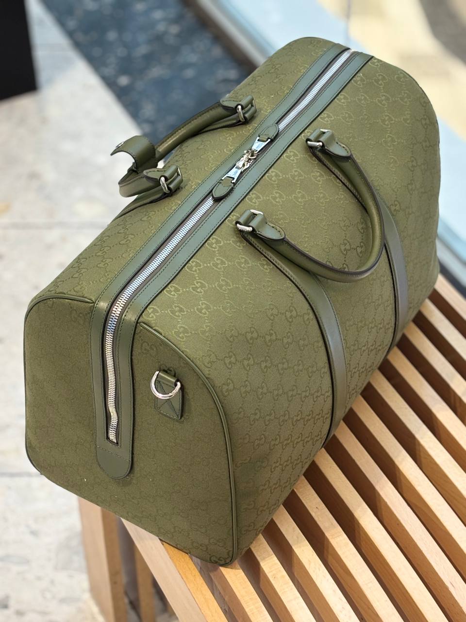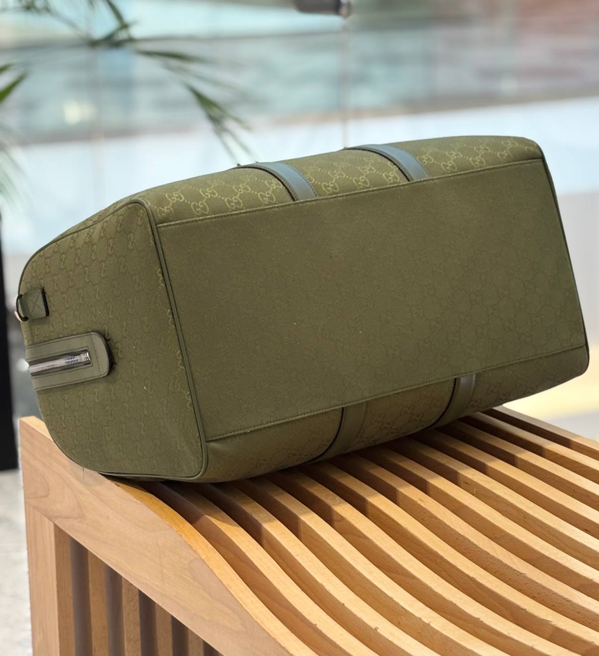 Дорожная сумка (саквояж) в лаконичном оливковом монохроме с фирменной биркой и регулируемым ремнём из прочного текстиля с тиснёной монограммой и кожаными акцентами.