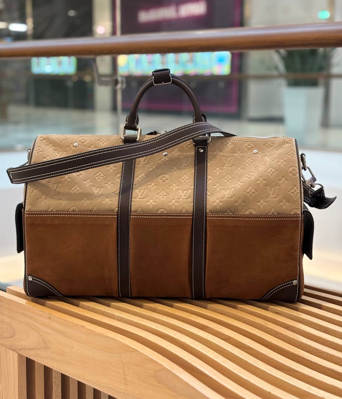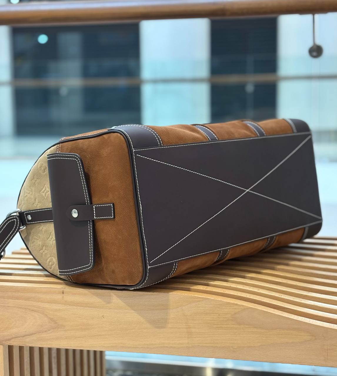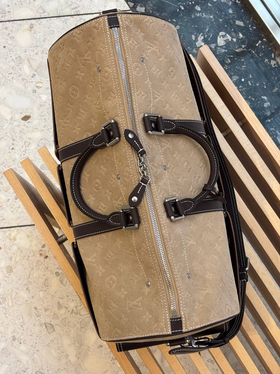 Благородная дорожная сумка для путешествий: тёплые коричневые тона, сочетание мягкой замши и плотной кожи, контрастная прострочка и хромированная фурнитура — элегантный спутник для коротких поездок.