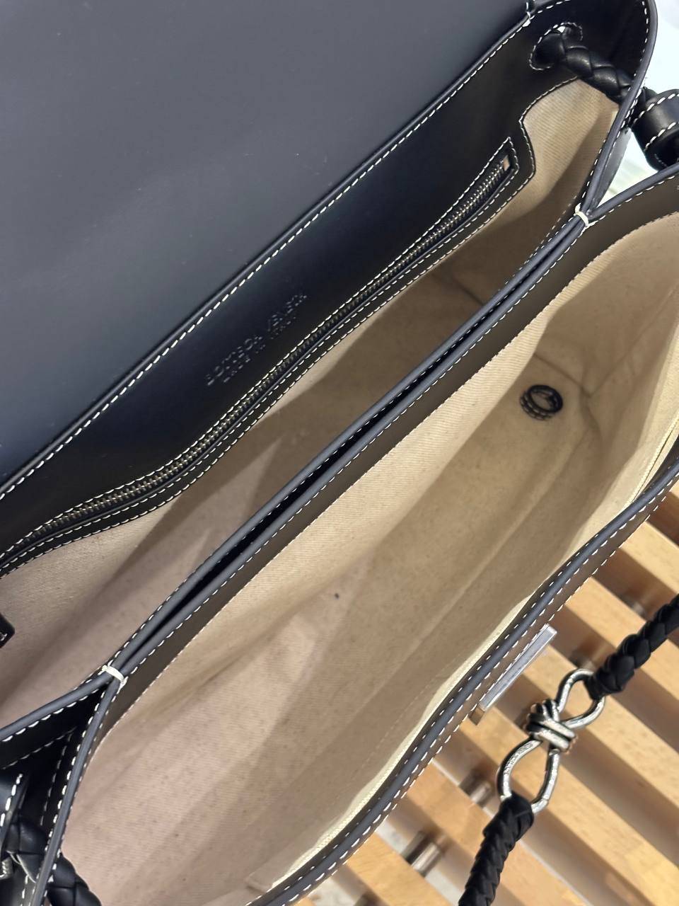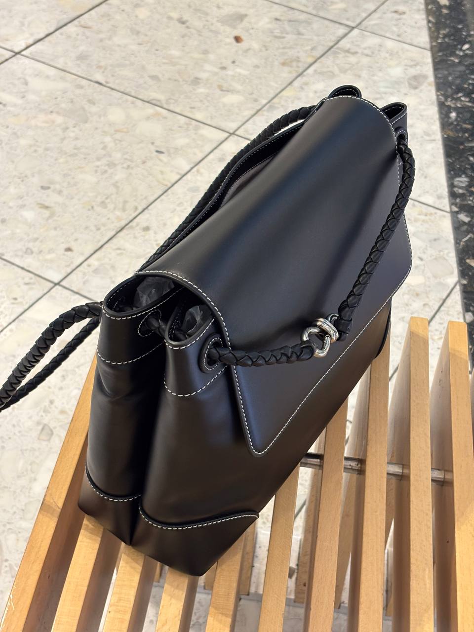 Черная кожаная сумка через плечо — гладкая матовая кожа, контрастная прострочка и плетёный ремешок с металлокомпозицией делают её идеальной спутницей от деловой встречи до вечернего коктейля.