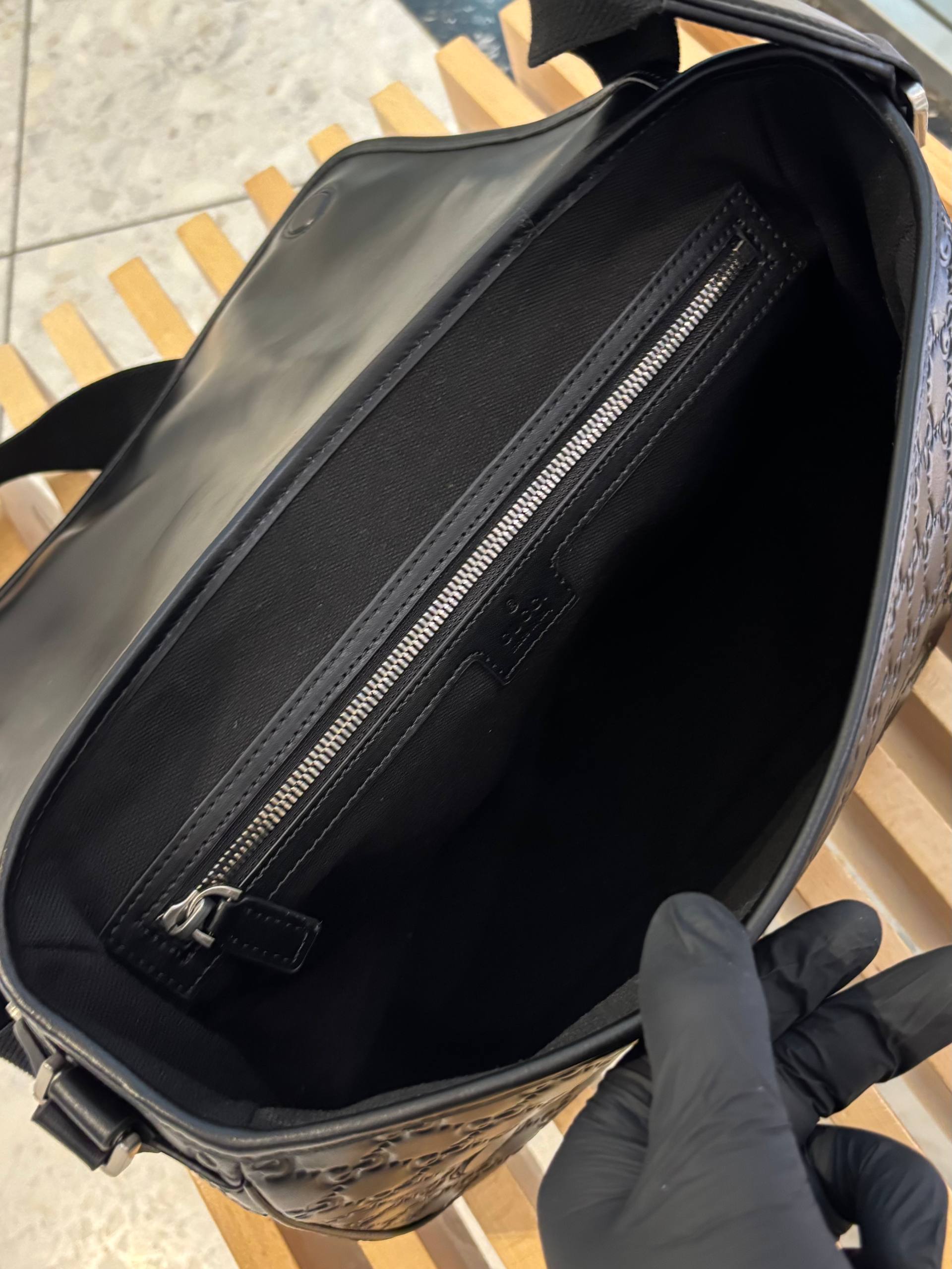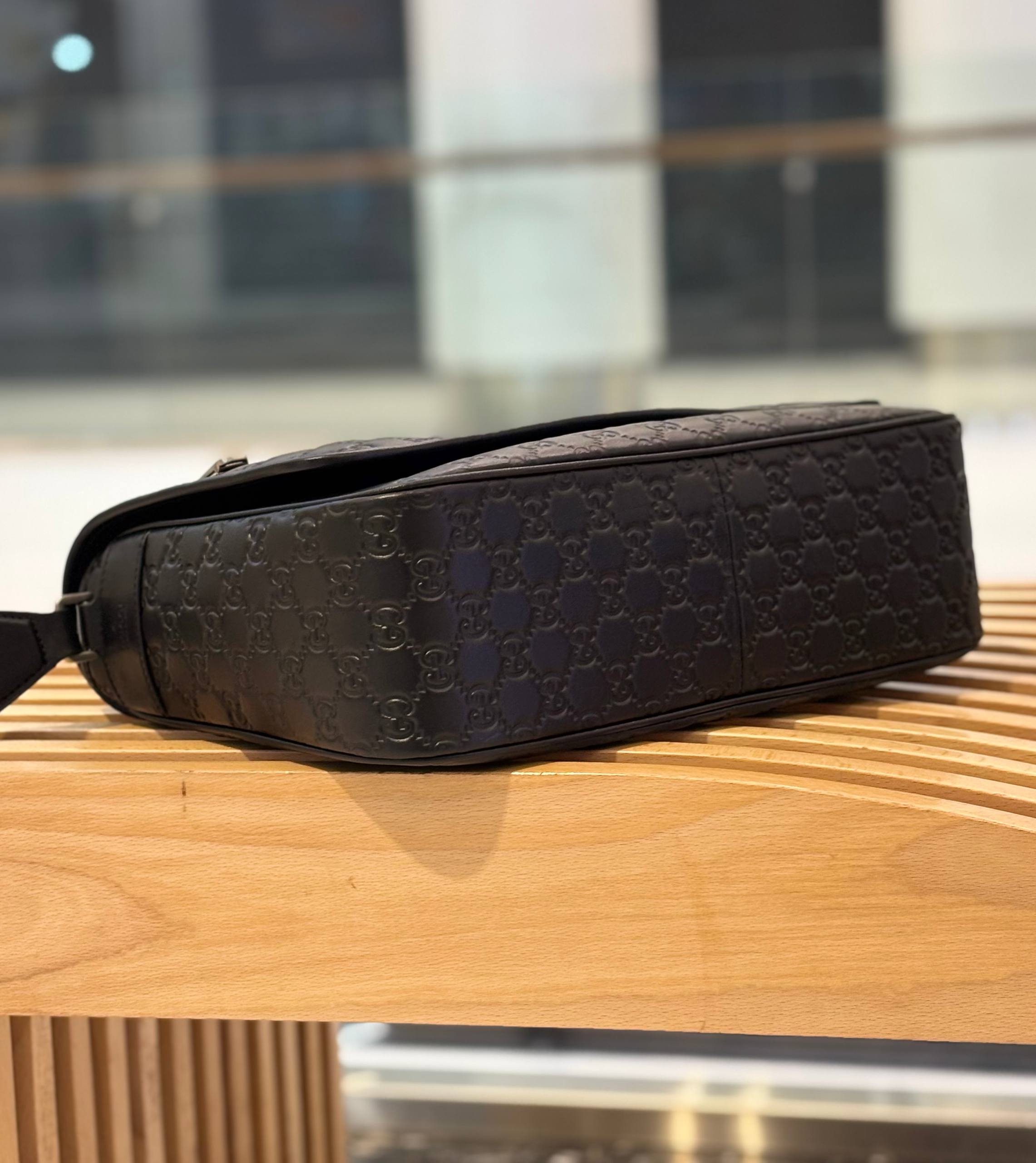 Черный кожаный мессенджер с тиснёным монограммным узором — сдержанная роскошь для повседневных побед.