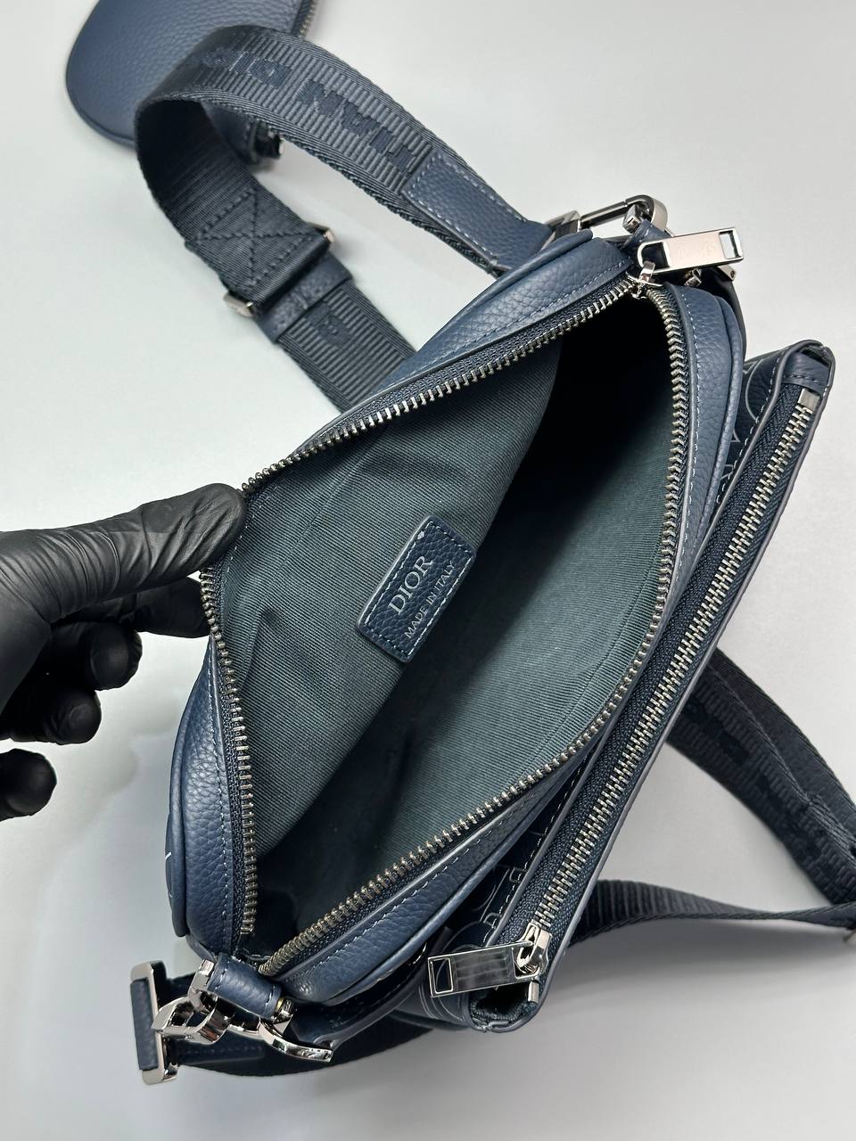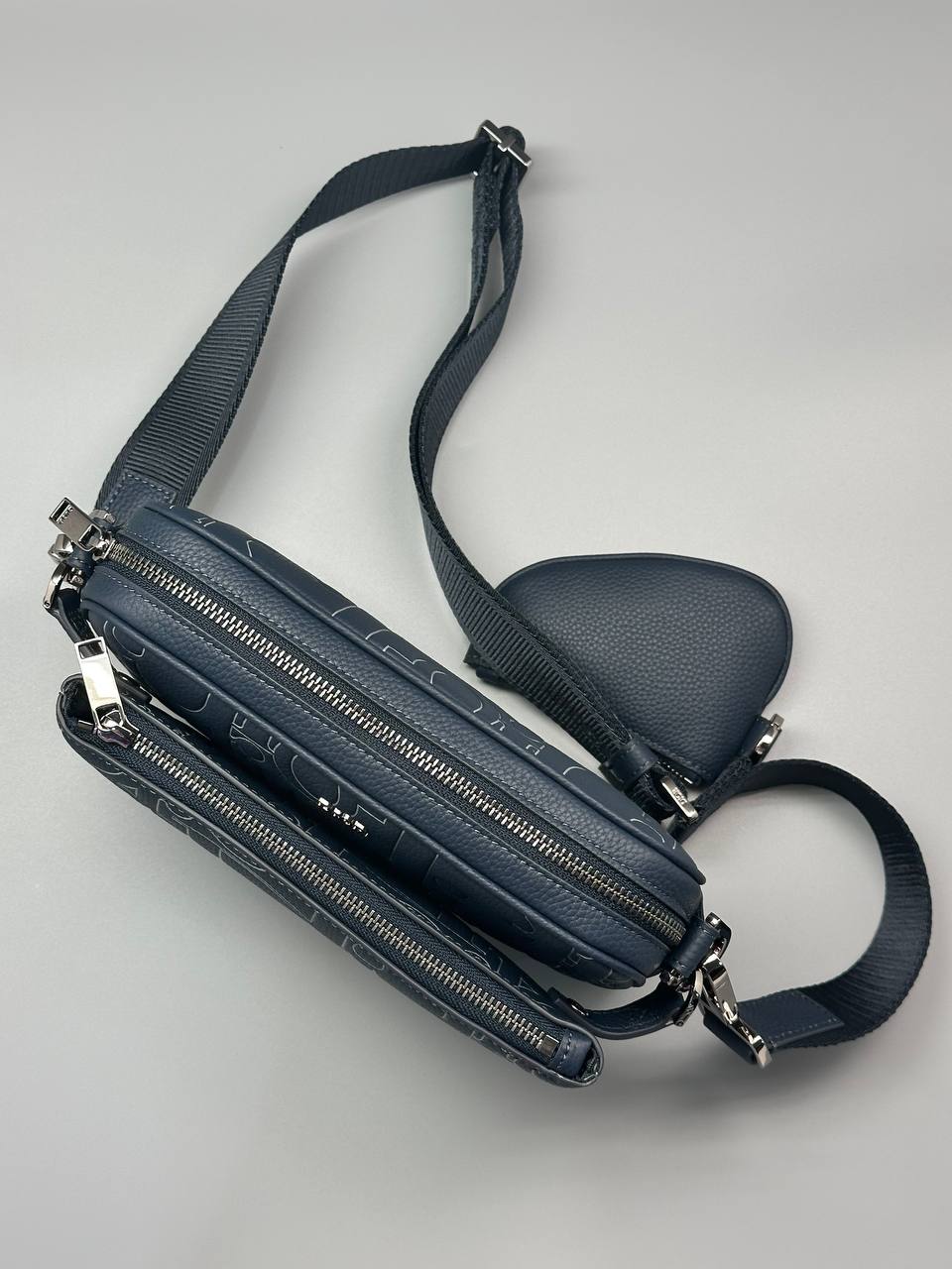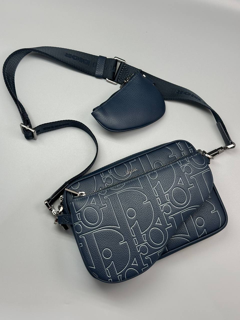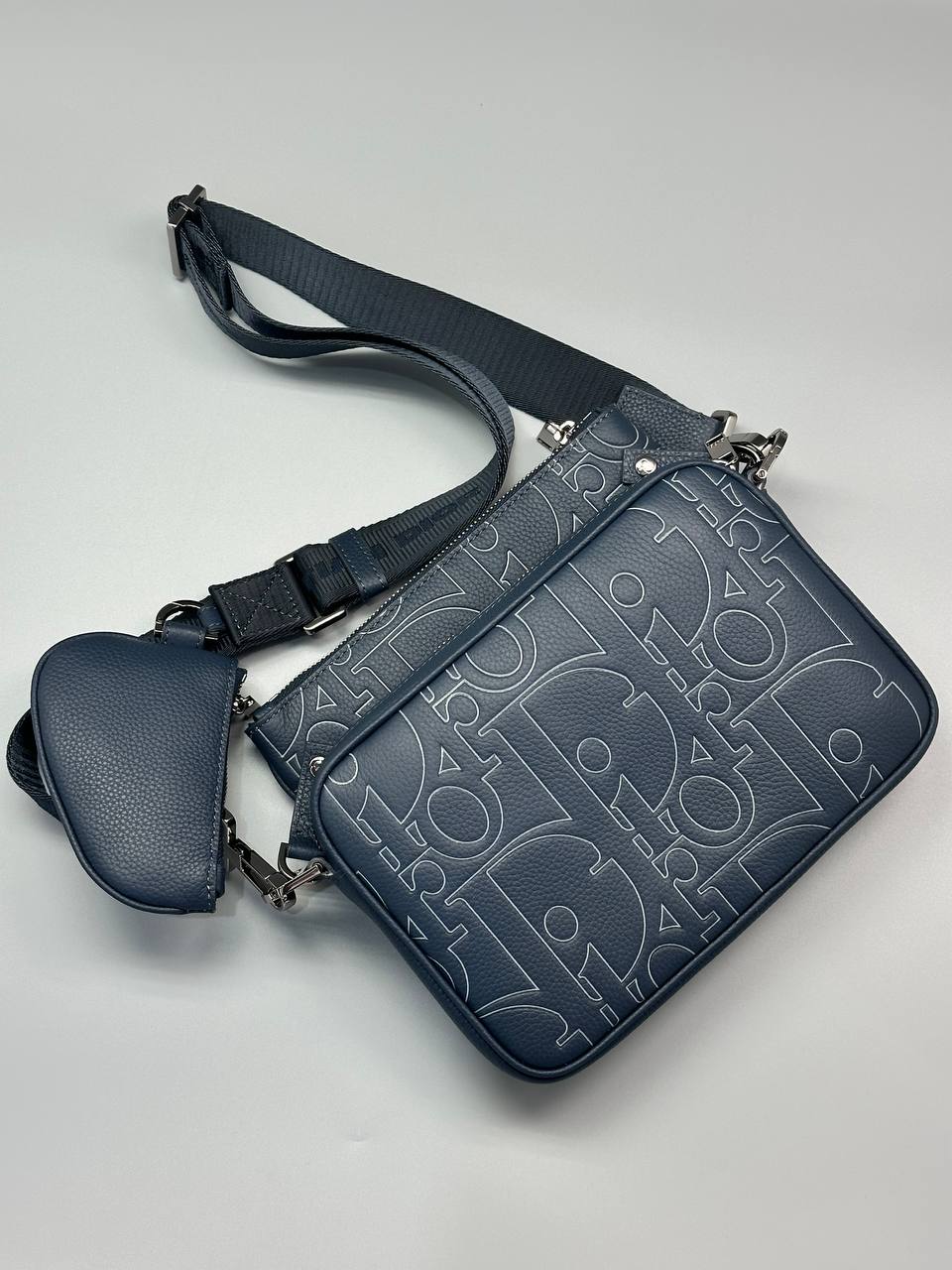 Стильная мужская сумка выполнена из качественной синей зернистой кожи с уникальным тиснением фирменного логотипа, что подчёркивает современный дизайнерский стиль бренда.