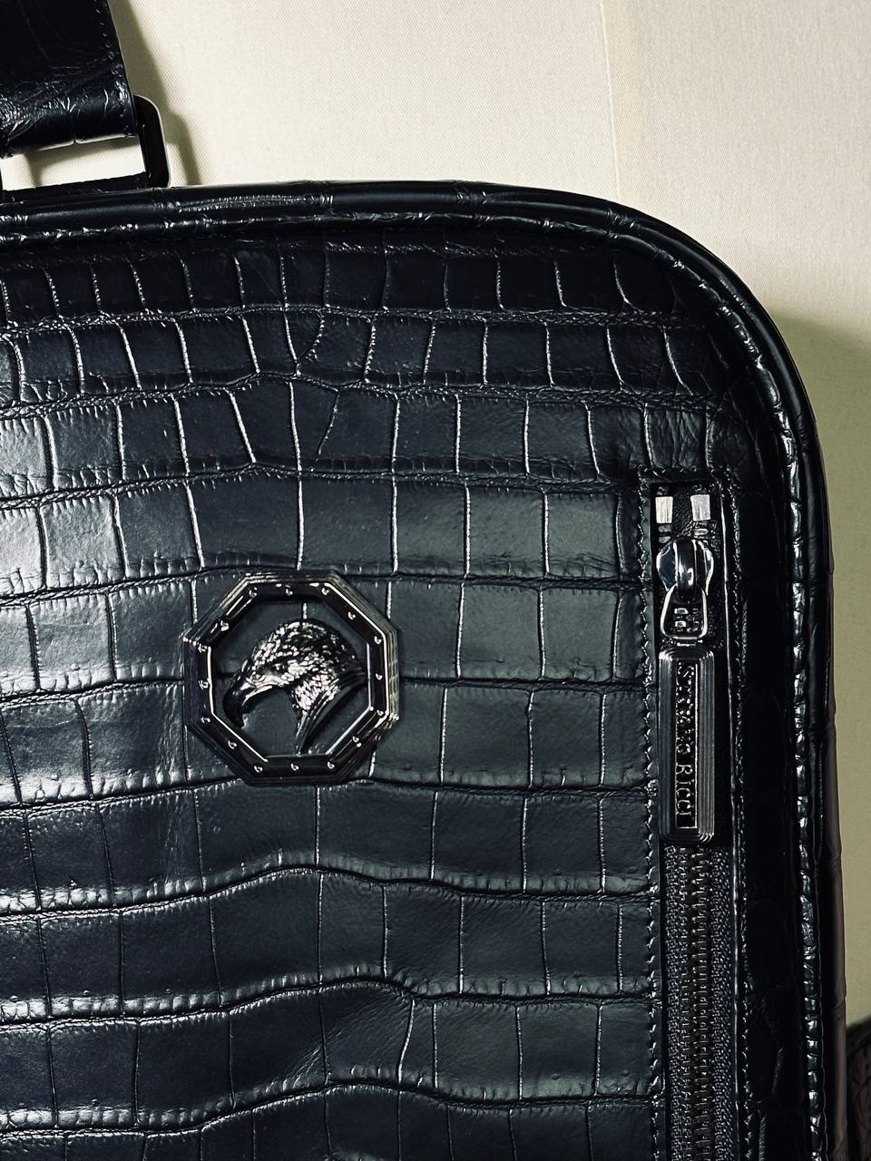 Мужская наплечная сумка из кожи крокодила с матовой поверхностью и лаконичным дизайном от люксового модного бренда.