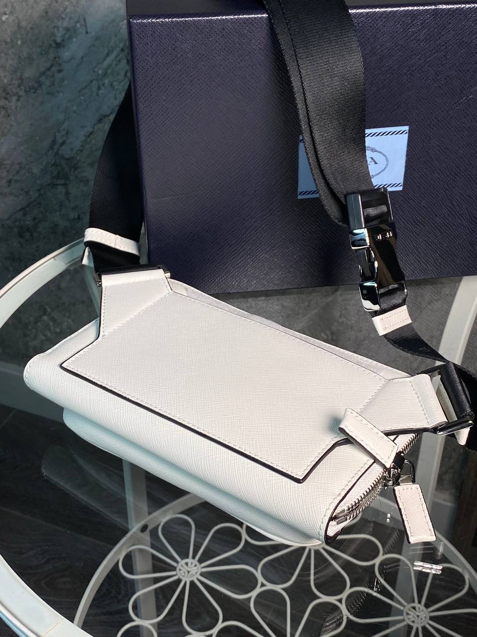 Стильная поясная сумка из белой кожи, дополненная серебристыми деталями, подчеркивает современный минималистичный дизайн.