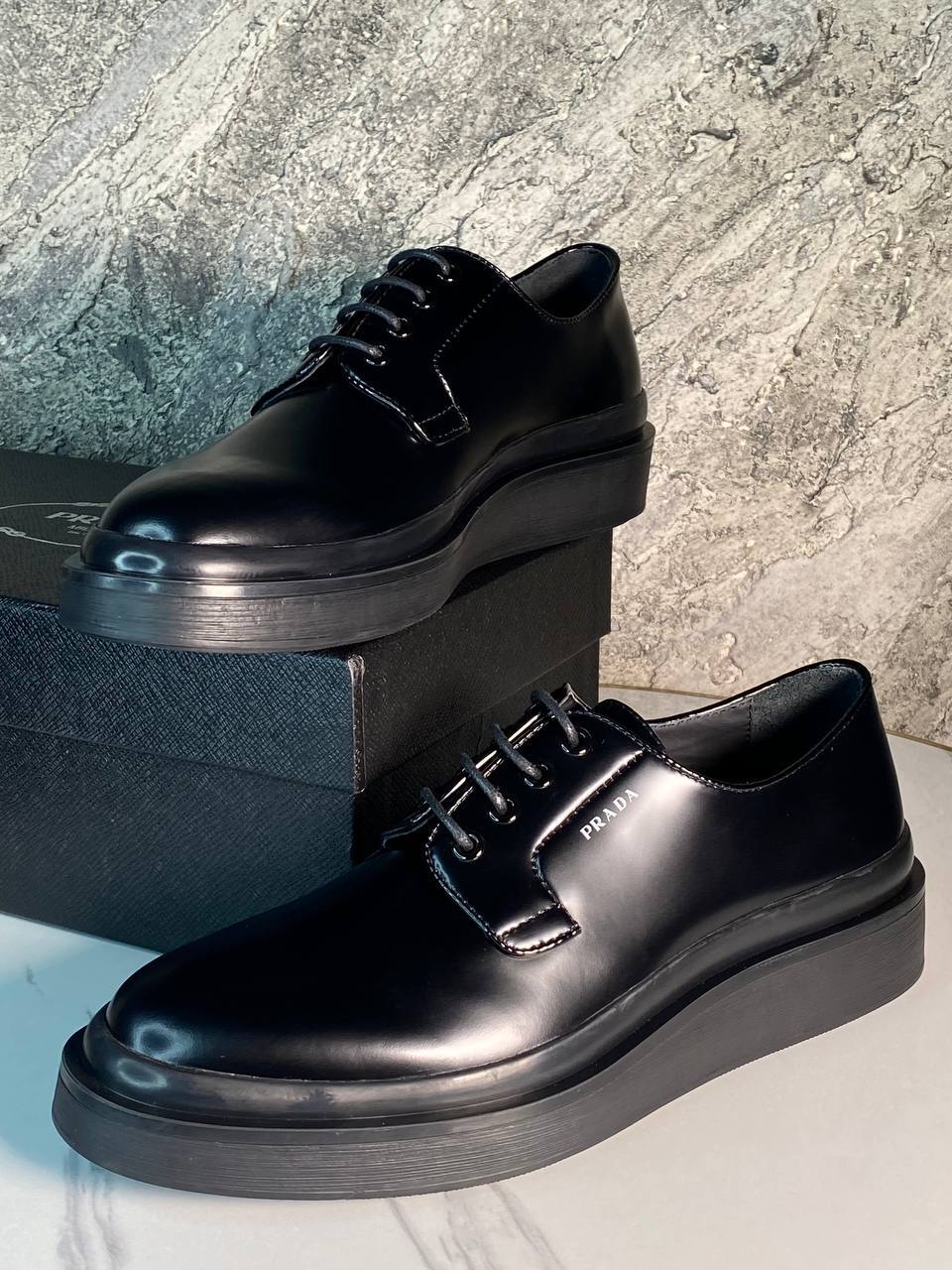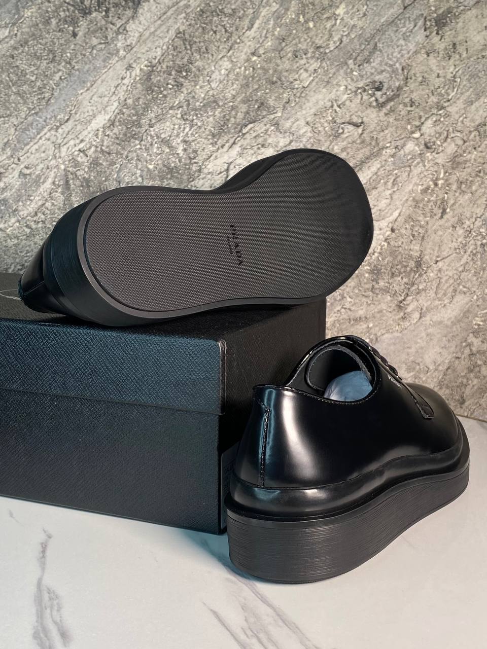Классические туфли-дерби из глянцевой кожи черного цвета. Элегантный и современный дизайн с брендингом на подошве.
