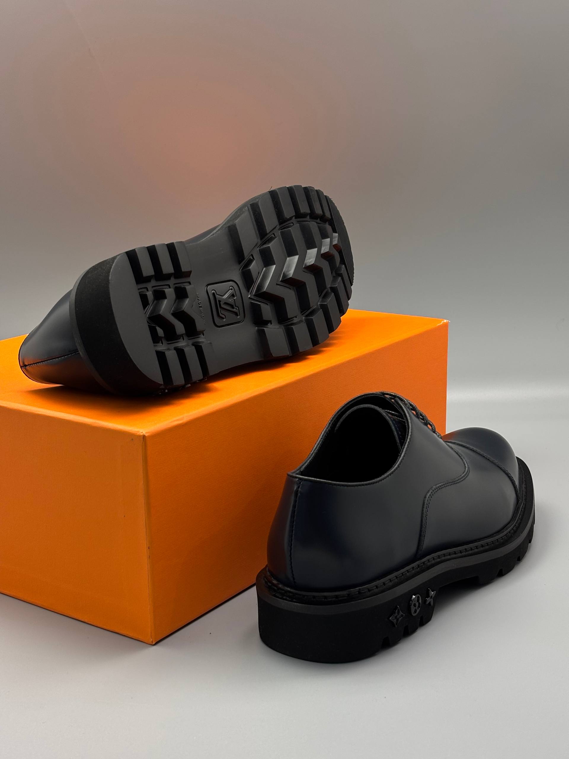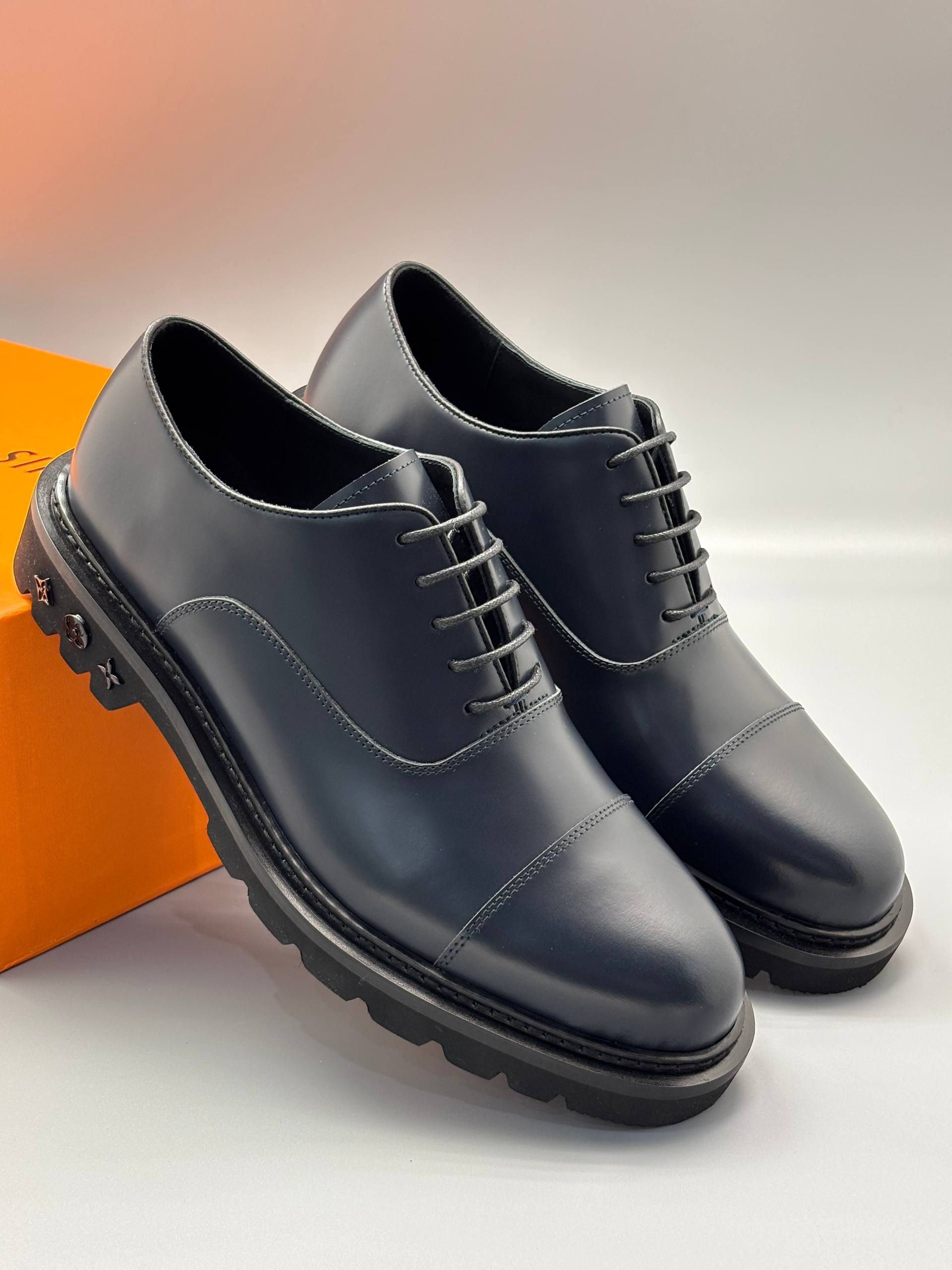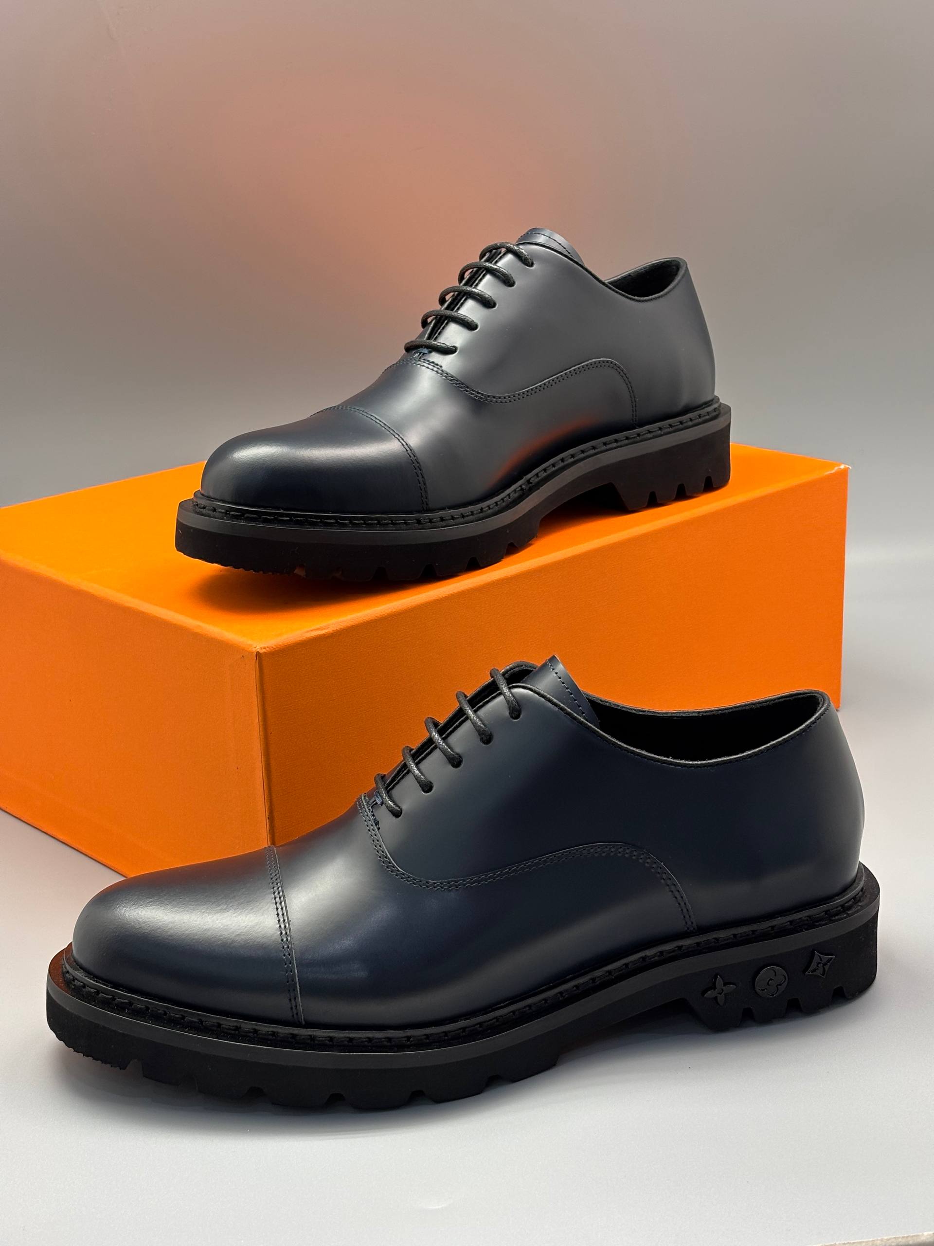 Темно-синие дерби из гладкой кожи — классика с современной душой: благородный блеск, аккуратные швы и массивная рифленая подошва для уверенных шагов.