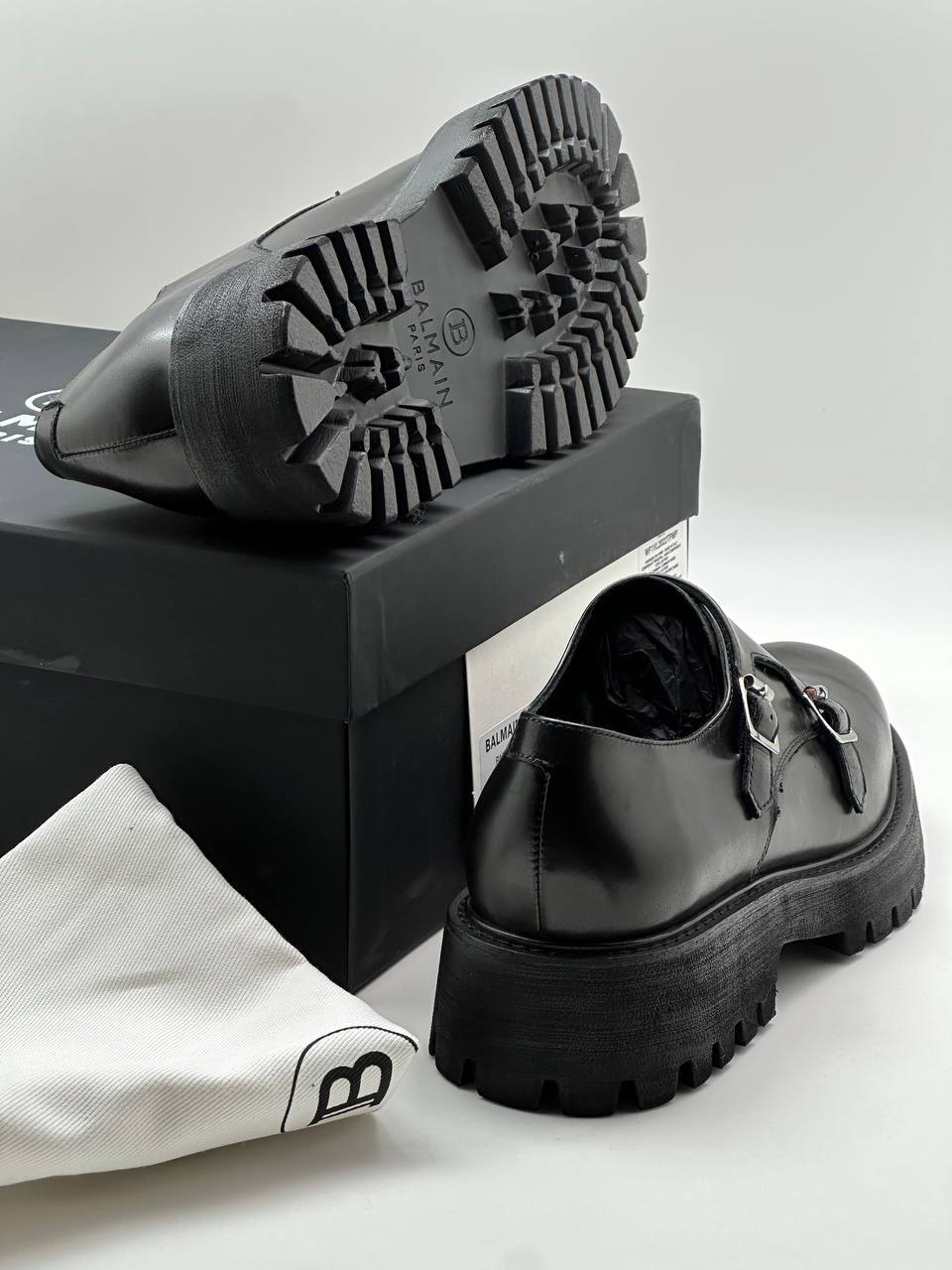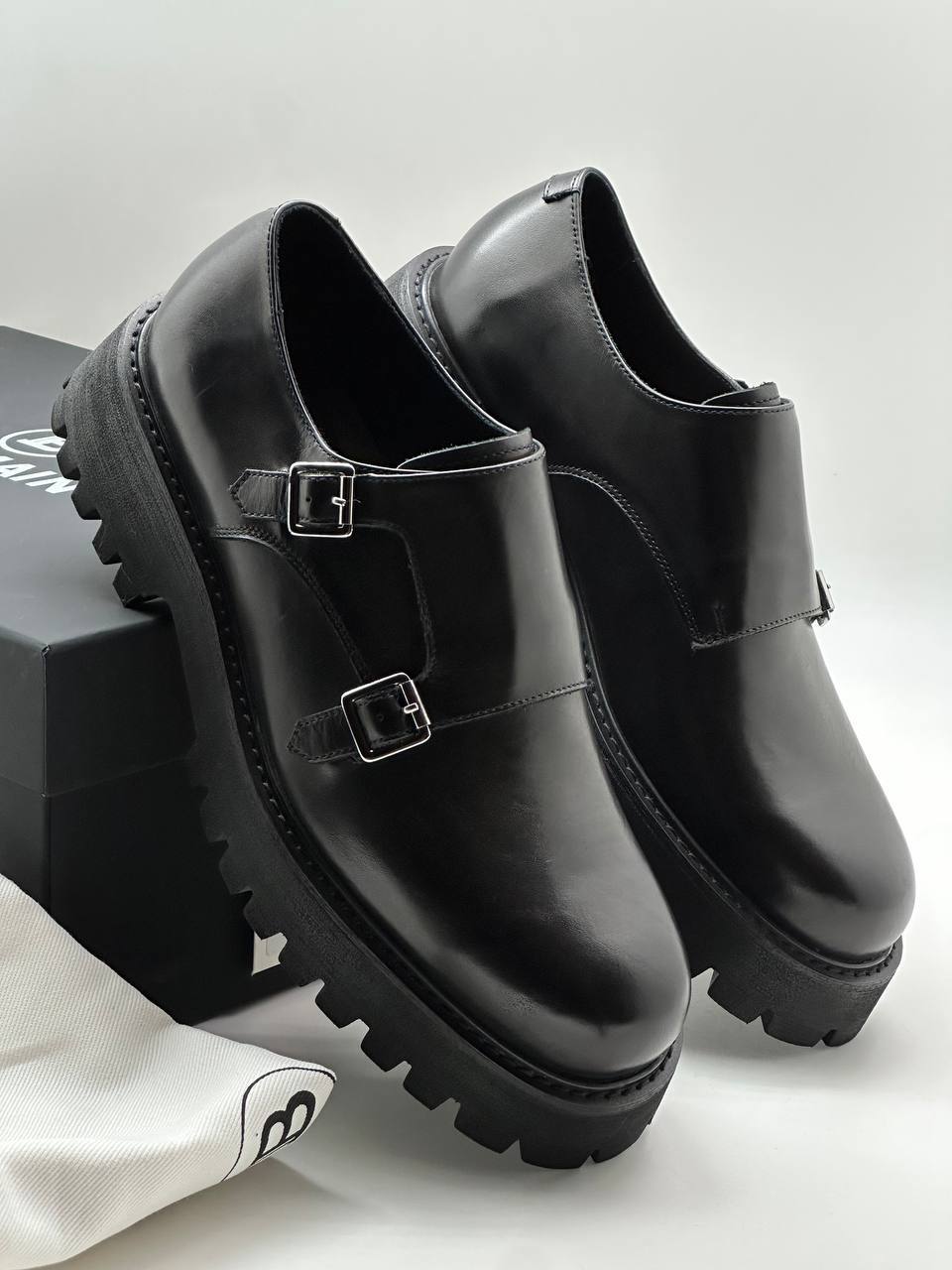 Строгие монки из натуральной кожи, утончённые металлические застёжки и выразительная рифлёная подошва — смелый минимализм и прочный дизайн.
