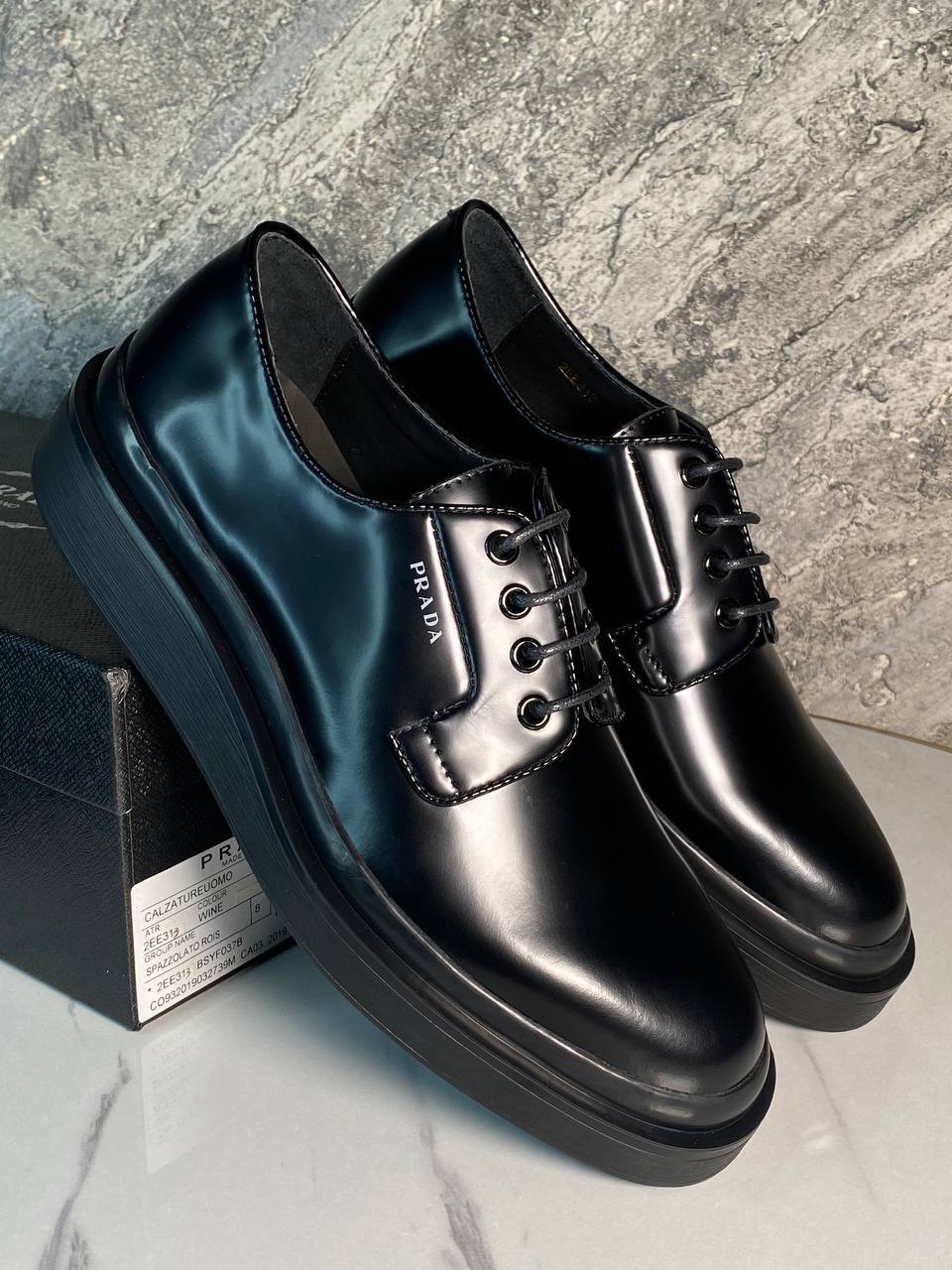 Классические туфли-дерби из глянцевой кожи черного цвета. Элегантный и современный дизайн с брендингом на подошве.